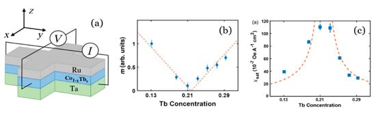 Using GdCoFe alloys with concentrations that present magnetic compensation at room temperature and PMA, Roschewesky et al. [,] have achieved interfacial torque in ultra-large thickness layers (up to 30 nm) with high thermal stability. The ability to switch magnetization in such thick ferrimagnets while keeping a high thermal stability might have important implications for future applications of SOT devices. Other ferrimagnetic alloys, based on Tb instead of Gd, also show an increase in SOT efficiency close to Tcomp (see Figure 9) []. It has been shown that in these ferrimagnetic RE–TM alloys, the SOT switching in combination with the fast magnetic dynamics and minimal net magnetization promises faster spintronic devices than those with traditional ferromagnetic systems. Figure 9a shows the typical way to characterize the SOT effect using the extraordinary (or anomalous) Hall effect. The electric current goes through the heavy metal (Ta) and the voltage is measured in the film plane but perpendicularly to the polarized current.