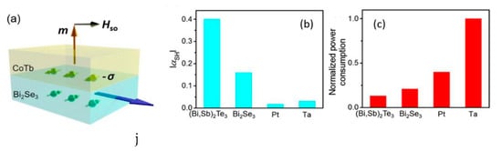 (a) Schematic heterostructure TI/RE–TM alloy. The charge current je generates spin accumulation (−σ) that is perpendicular to the current direction at the interface and exerts a spin–orbit torque on the magnetic moment in the CoTb PMA alloy. (b,c) Absolute values of the effective spin Hall angle and power consumption of different spin–orbit materials, showing the higher efficiency of TI vs. traditional heavy metals such as Ta and Pt. Reprinted with permission from ref. []. 2017 APS.