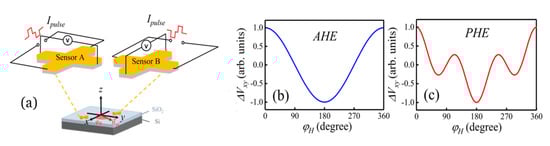 We can find a practical application of a SOT device in angular position sensors. This type of sensors has a wide range of applications in manufacturing, consumer products, and automotive engineering []. As stated above, many kinds of MR sensors have been developed in the last 50 years to probe magnetic fields, as in the reading heads of hard disks. Depending on the orientation of the sensor and the external field, they yield a sinusoidal output signal. Thus, these devices can act as an angular position sensor as well. However, they usually require complicated structures (magnetic multilayers) and complex manufacturing processes that make them more expensive than traditional Hall sensors. Hence, Luo et al. [] have recently designed an angular position sensor based on SOT (see Figure 11). It consists of two orthogonally positioned Hall crosses to measure the X and Y axis simultaneously and compose the 2D vector. The structure they employ is a heavy metal/ferromagnet (HM/FM) bilayer (in particular, Pt3nm/Co3nm), and they obtain an average angle error of only 0.65° over 360° from the prototype device. This design is already simpler and cheaper than its MR counterpart, but its design could be further improved by optimizing the choice of materials, for example using RE–TM alloys instead of Co, as we might tune the magnetic parameters (saturation magnetization, coercivity, temperature dependence, etc.) with a proper election of RE and composition.