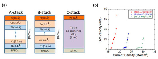 (a) Different Tb–Co ML and alloy structures with perpendicular magnetic anisotropy, (b) Current density dependence of DW velocity for magnetic wires with these structures. Reprinted with permission from ref. [] 2016 APS.