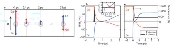 - Ostler, T.A.; Barker, J.; Evans, R.F.L.; Chantrell, R.W.; Atxitia, U.; Chubykalo-Fesenko, O.; El Moussaoui, S.; Le Guyader, L.; Mengotti, E.; Heyderman, L.J.; et al. Ultrafast heating as a sufficient stimulus for magnetization reversal in a ferrimagnet. Nat. Commun. 2012, 3, 666. [Google Scholar] [CrossRef] [PubMed] [Green Version]