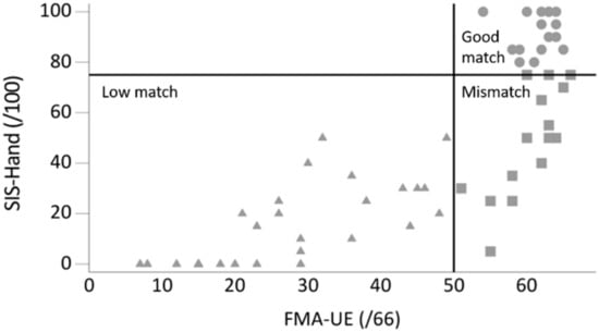 Graph plotted with perceived upper limb activity (SIS-Hand: hand domain of the Stroke Impact Scale) against observed upper limb function (FMA-UE: Fugl-Meyer Assessment upper extremity) score showing three groups: low match (n = 29; FMA-UE ≤50, SIS-Hand ≤75), mismatch (n = 15; FMA-UE >50, SIS-Hand ≤75), and good match (n = 16; FMA-UE >50, SIS-Hand >75).