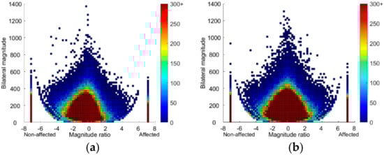 Density plots showing 24 h of upper limb activity in the (a) mismatch group (n = 15; Fugl-Meyer Assessment upper extremity FMA-UE >50, hand domain of the Stroke Impact Scale SIS-Hand ≤75) and (b) good match group (n = 16; FMA-UE >50, SIS-Hand >75) plotted on a second-by-second basis. The magnitude ratio (x-axis) indicates contribution of each limb to activity. The bilateral magnitude (y-axis) indicates the activity intensity. The color represents frequency, with brighter colors indicating greater frequencies. Bars at −7 and 7 show unilateral unaffected and affected UL activity, respectively.