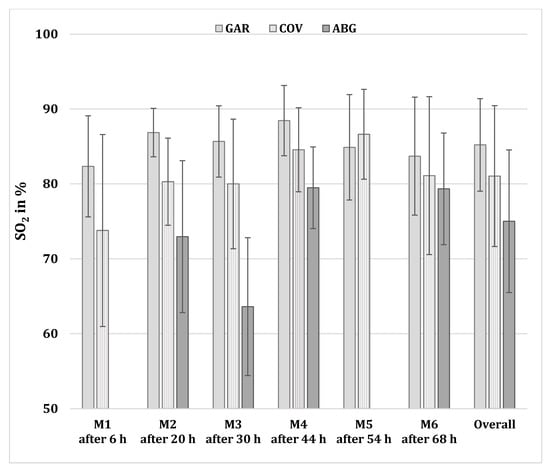 Figure 1 displays the mean and SD values for SO2 measurements at all time points at high altitude. Overall, SO2 values obtained with GAR were highest (85.2% ± 6.2), compared to 81.0% ± 9.4 for those obtained with COV (p = 0.011) and 75.0% ± 9.5 for those obtained with ABG (p ≤ 0.001). Mean SO2 differences between GAR vs. ABG were 7.0%, compared to 0.1% between COV vs. ABG.
