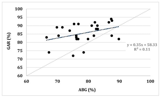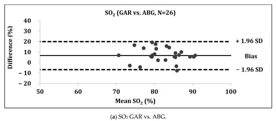 The Pearson’s r indicated a strong correlation between COV vs. ABG (0.904; p < 0.001; R2 = 0.735) and a weak correlation for GAR vs. ABG (0.380, p < 0.001; R2 = 0.109). The median of the individual Pearson’s r correlation coefficients between GAR and COV was 0.534, ranging from −0.5 to 0.909. Correlational analysis did not reveal a significant magnitude dependence of the difference between ABG and GAR and the average between ABG and GAR (r = 0.1, p = 0.625). Figure 2 shows the regression line of ABG vs. GAR in comparison to the line of identity. In three measurements with very low ABG results (SaO2 ≤ 70%), GAR did not report any SpO2 readings.