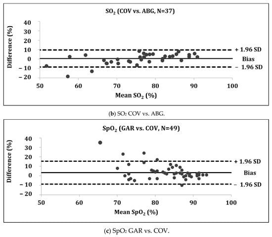 Bland–Altman analysis indicated a low validity of GAR measurements (mean difference compared to ABG: 7.0%) with wide limits of agreement (−6.5; 20.5%), whereas the validity of COV was good (mean difference compared to ABG: 0.1%) despite wide limits of agreement (−10.7; 10.9%) (Figure 3).