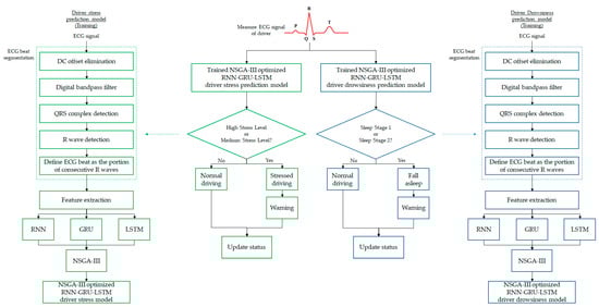 The conceptual diagram of the proposed NSGA-III optimized RNN-GRU-LSTM model is given in Figure 1. Both the driver stress prediction and driver drowsiness prediction models are implemented using identical approaches. Green boxes refer to the driver stress prediction model, whereas blue boxes refer to the driver drowsiness prediction model. The ECG signal of the driver is continually measured and serves as the input of the trained NSGA-III optimized RNN-GRU-LSTM model. ECG beat segmentation is performed on the ECG signal to obtain the individual ECG beat. The key steps are to: (i) eliminate the direct current (DC) offset; (ii) apply a digital bandpass filter; (iii) detect the QRS complex (combination of Q wave, R wave, and S wave) of the ECG signal; (iv) detect the R wave; and (v) define ECG beats as the constituents of two consecutive R waves. After ECG beat segmentation, the features of the ECG beats are extracted. NSGA-III is applied to optimally design the RNN-GRU-LSTM prediction model. We define high stress levels and medium stress levels as undesirable driving statuses in driver stress prediction; if detected, a warning message can be initiated to alert drivers. Regarding driver drowsiness prediction, the initiation of sleep stage 1 or sleep stage 2 will lead to a warning message.