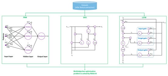 - Attributed to the advantages and disadvantages of the RNN, GRU, and LSTM algorithms, optimally merging the algorithms would enhance the performance of the prediction model compared with the stand-alone-based algorithm. The optimization problem is solved by NSGA-III because it not only enhances the diversity of the new population but also requires computing power with a small population size [,].