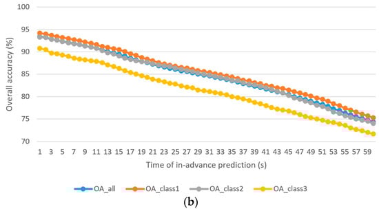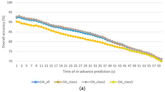 Figure 4 shows the , , , and  of the driver stress prediction model and driver drowsiness prediction model with 1–60 s in-advance prediction. The following observations are made: