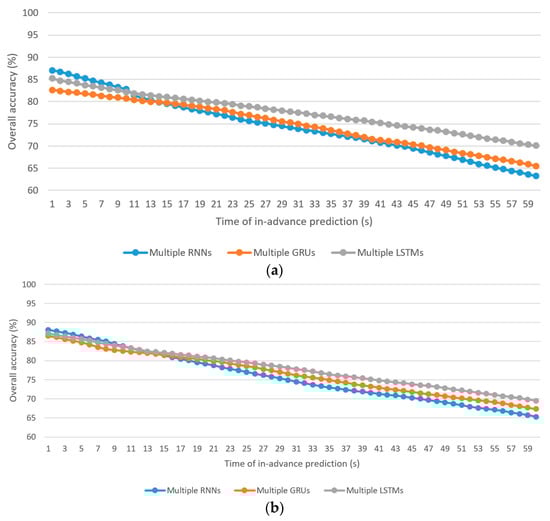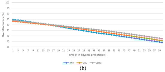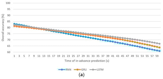 - The worst using the individual RNN, GRU, and LSTM algorithms for driver stress prediction are 60.9%, 63.7%, and 66.8%, respectively, at 60 s in-advance prediction, whereas those for driver drowsiness prediction are 63.6%, 65.5%, and 67.5%, respectively, at 60 s in-advance prediction.
