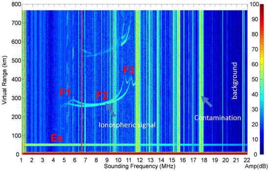 An ionogram containing three key features: the background, the contamination, and the ionospheric signal. The color bar on the right represents the amplitude of the signal in Decibels (dB).