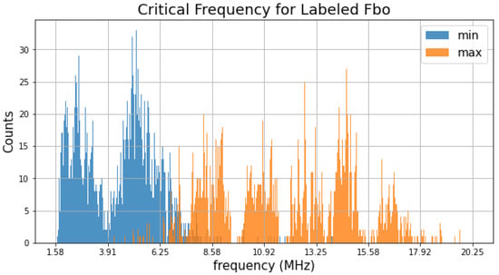 Distributions of the maximum (blue) and minimum (orange) frequencies of the labeled F2 layer of the ionograms.