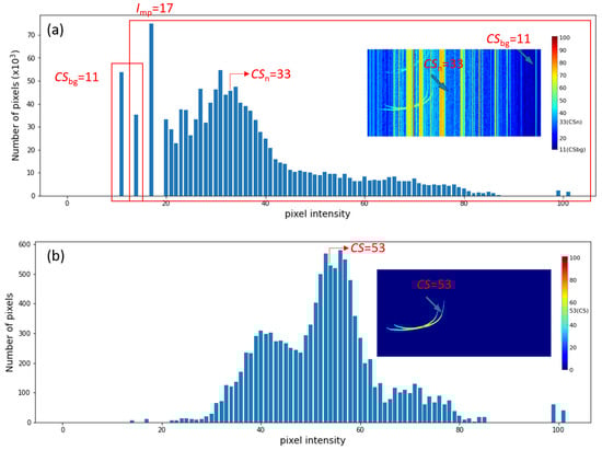 (a) The histogram of the pixel intensity I of the entire ionogram inserted on the right. (b) The histogram of the pixel intensity of the useful signal of the ionogram inserted on the right.