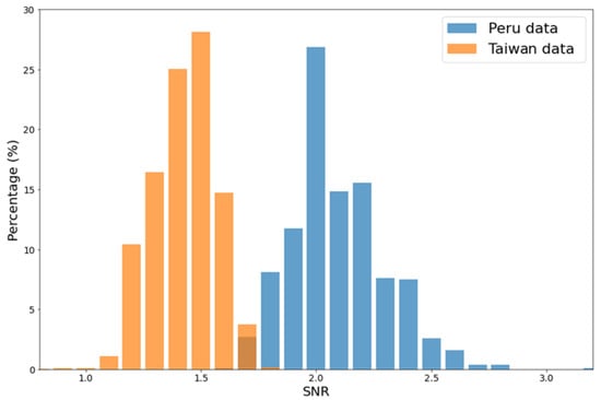 The distributions of the SNR are presented in Figure 4. The histogram for Taiwan data of 6131 ionograms is shown by orange. For comparison, we show the histogram for Peru data by blue. The Peru dataset consisted of 816 manually labeled ionograms acquired from Jicamarca ionosonde (see the details in []). It can be seen clearly that the SNRs of Peru data, with a mean SNR = 2.09, were predominantly higher than those of Taiwan data, with a mean SNR = 1.43. In other words, almost all Peru ionograms were cleaner than the Taiwan ionograms.