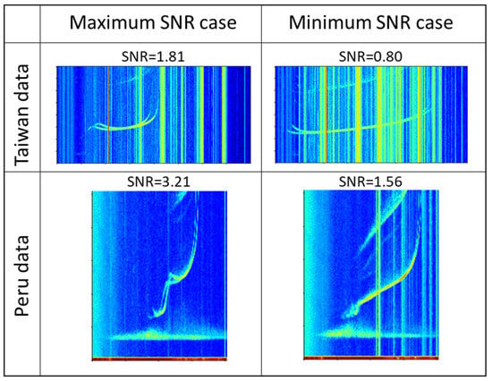 Figure 5 shows the comparison of the maximum and minimum SNR cases for Peru and Taiwan. We can see that the ionospheric signals in the noisiest Peru ionogram case, which had an SNR = , were still clearly distinguishable from the noise and background. However, it was difficult to determine the ionospheric signals for the noisiest Taiwan ionogram case, which had an SNR = .