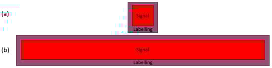 Let us consider a simple case of a rectangular signal and labeling. In Figure A1, the signal is shown by the red rectangle and the labeling area is the green rectangle. The signal has a length L and thickness t. The labeling boundary has a characteristic offset v from the signal.