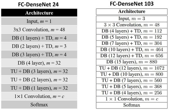 Fully Convolutional DenseNet (FC-DenseNet) is a Fully Convolutional Network (FCN) model evolved from a CNN model called DenseNet. Our specific model, FC-DenseNet24, was created based on FC-DenseNet103 []. The basic building blocks of FC-DenseNet103 are the Dense Block (DB), Transition Down (TD), and Transition Up (TU). The composition layers of DB, TD, and TU are shown in Table 2.
