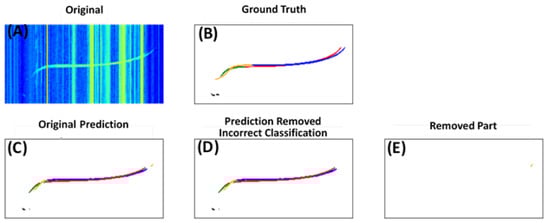 In Figure 9, two examples of the double-filtering results are shown for the incorrect classification filter and in Figure 10 for the echo filter. In both figures, different classes of the signals are represented by different colors: black: esa; green: fao; yellow: fax; red: fbo; blue: fbx. In Figure 9C, some yellow pixels (fax) can be seen at the upper right end of the originally predicted signals. Since they are outside of the boundary for fax, they were identified as incorrect classification and removed by the filter.