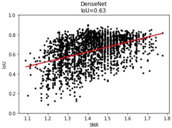 The scatter plot of the IoU vs. SNR for the prediction results is shown in Figure 11. It can be seen that a low IoU (<0.5) occurred predominantly for a smaller SNR (<1.5), while a high IoU occurred when SNR > 1.4, which is very close to the median SNR = 1.43. This shows that the noise had a serious impact on the model accuracy and that the model operation was reasonable.