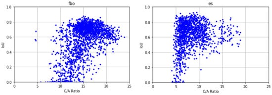 - C/A ratio:As explained earlier, our “ground truth” occupied an area larger than the area of the true signal because we labeled around the outer edge of the signal. Therefore, even if the model perfectly predicted the true signal, the IoU, which compares the prediction with the “ground truth”, would still be less than one. The derivation in the earlier section showed that the lower the C/A, the lower the IoU of the perfect prediction. As can be seen from the ionogram layers in Figure 1, F1 layers usually had a lower C/A than Es layers, which can contribute to the lower IoU for fao and fax. Figure 12 shows the scatter plots for compact and elongated signals for Es layers and F2 layers, respectively. The elongated F2 signals show that they had a high IoU in the regions where C/A was high. For the Es signals, we see a similar result wherein the high IoU cases were associated with the high C/A cases. It is evident that there was an inevitable decrease in the IoU as a result of labeling for both the compact and the elongated cases of the signal shape.