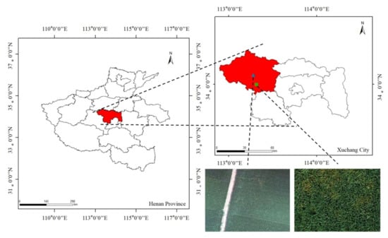 The study area. The left part shows the legend of Henan Province, and the red area indicates Xuchang City. The upper right part shows the legend of Xuchang City; the red area indicates Yuzhou City, the blue triangle indicates the wheat field in Dahuai Village, and the green square indicates the wheat field in Xigolou Village.