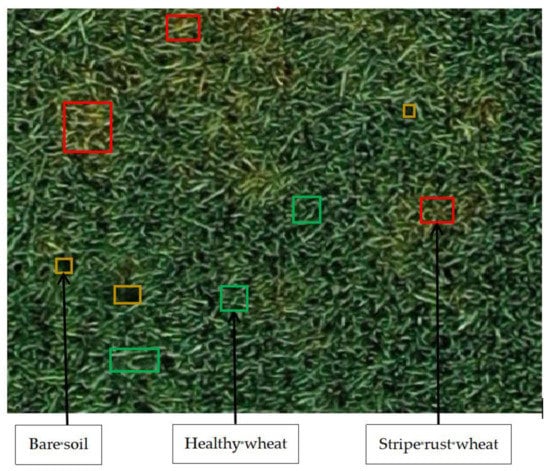 A UAV image with the three categories of samples labeled. The red squares indicate yellow rust wheat, the yellow squares indicate bare soil, and the green squares indicate healthy wheat.