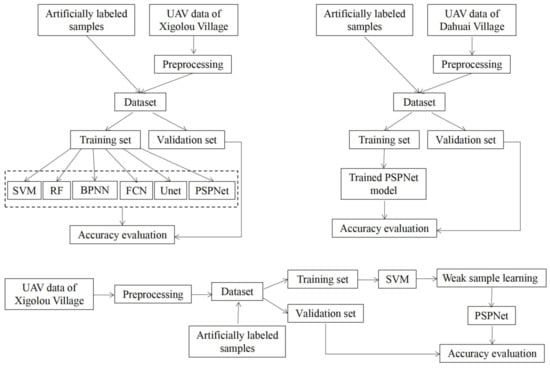 This study compared the recognition effects of several categories using SVM, RF, BPNN, FCN, U-Net, and PSPNet models on the UAV image dataset acquired from the Xigolou Village plot, investigated the spatial generalization of the PSPNet model with the best recognition effect on the UAV images from the Dahuai Village plot, and finally solved the sample labeling problem based on the weak-sample learning approach. This section focuses on the design scheme of the experiments, the network architecture of the PSPNet semantic segmentation model, the method of weak-sample learning, and the evaluation index of accuracy.