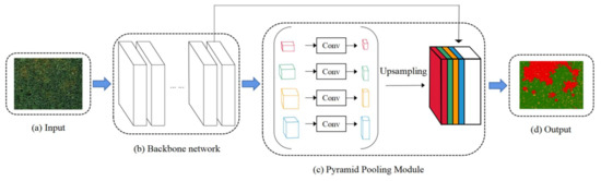 The flow of identification of yellow rust of wheat based on PSPNet: (a) a drone image of a wheat field; (b) the backbone network of the PSPNet model; (c) the pyramid pooling module; (d) the predicted output results of the original image, where the red area indicates wheat with yellow rust, the green area indicates healthy wheat, and the yellow area indicates bare soil.