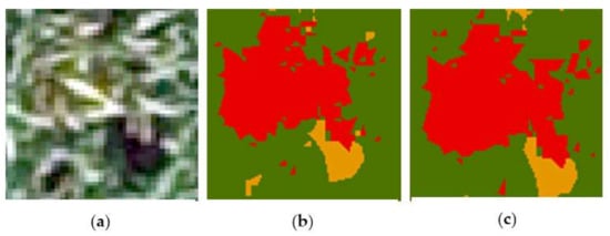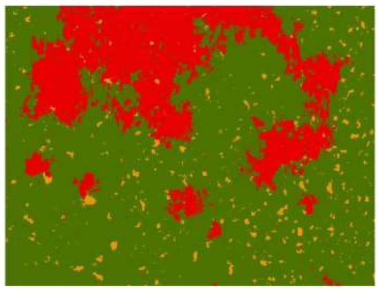 Compared with Figure 5, we found that the classification results obtained by weakly supervised learning had slight image blending where the three categories of images were similar. Regarding this point, we selected a typical area containing yellow-rust-affected wheat, healthy wheat, and bare soil, and used the original image of the area, as well as the classification result map of the SVM method and the classification result map of the weak sample supervision method, as shown in Figure 9. It can be seen that the classification result maps produced under the weak-sample supervision method showed misclassification of image elements in the red, yellow, and green areas adjacent to each other. However, the overall recognition effect was still very good. As shown in Table 2, the F1 scores of healthy wheat, wheat with yellow rust, and bare ground were 0.93, 0.80, and 0.95, respectively, and the OA was 94%. This was almost consistent with the accuracy of SVM, which compensated for the shortcomings of the deep-learning model’s high reliance on a great deal of ground truths, and also showed that the weakly supervised learning approach could also obtain high recognition accuracy. This method could maintain good classification performance without using a large number of manually labeled samples.