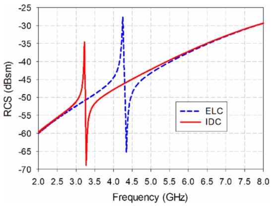 Comparison of the simulated monostatic RCS for the ELC resonator and the proposed IDC resonator.