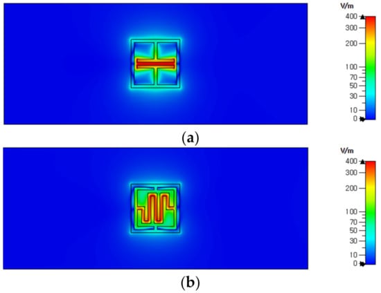 Figure 3 compares the electric field distributions at the resonant peak frequency of the ELC resonator and the proposed IDC resonator. In the ELC resonator, the electric field is concentrated between the capacitor-shaped plates, whereas in the proposed IDC resonator, it is concentrated between the plates of the IDC structure. It can be seen that the length of the plate of the IDC structure is longer than that of the conventional capacitor-shaped plate, so the equivalent capacitance of the resonator is larger, and the resonance peak frequency shifts to a lower frequency because of this.