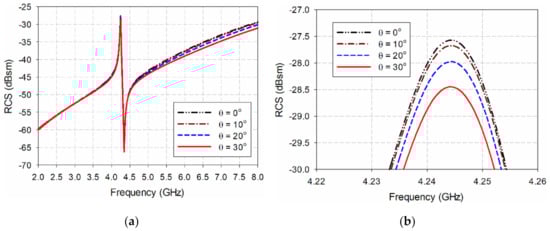 RCS characteristics of the ELC resonator when varying the incident angle: (a) 2–8 GHz, (b) 4.22–4.26 GHz.