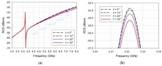 RCS characteristics of the proposed IDC resonator from varying the incident angle: (a) 2–8 GHz, (b) 3.20–3.24 GHz.