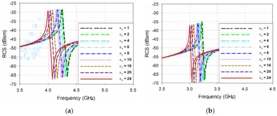 Comparison of RCS characteristics when varying the relative permittivity of the coated dielectric material for (a) the ELC resonator, and (b) the proposed IDC resonator.