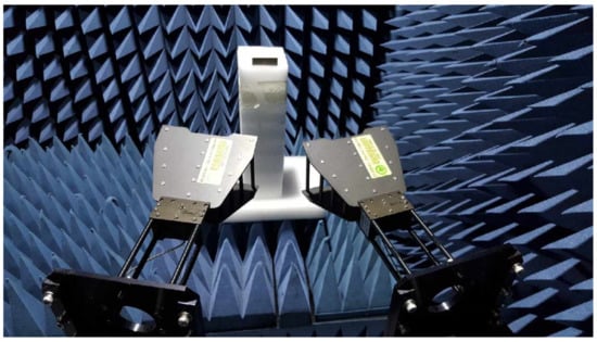 For RCS performance validation, the ELC resonator and the proposed IDC resonator were fabricated using an RF-301 substrate, as shown in Figure 7. Figure 8 shows the measurement setup in an anechoic chamber for RCS measurement. An N5230A vector network analyzer (Agilent, Santa Rosa, CA, USA) was used to measure the transmission coefficient (S21) using the transmit and receive antennas, and double-ridged horn antennas (C&G Microwave co. ltd., Daejeon, Korea) covering 2–18 GHz were used as the transmitting and receiving antennas. The distance between the transmitting/receiving antennas and the resonator under test was about 300 mm, and the transmit antenna had an incident angle of about 30° from the vertical direction of the tag surface.