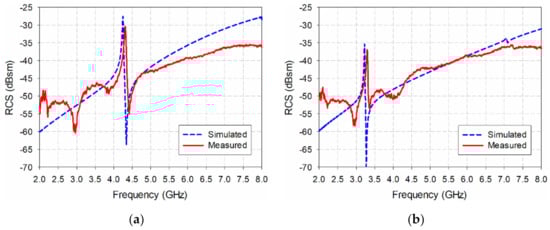 Figure 9 compares the simulated results with the measured bistatic RCS values for the ELC resonator and the proposed IDC resonator. In the ELC resonator, the resonant peak frequency and the value of the simulated bistatic RCS were 4.245 GHz and −28.46 dBsm respectively. The measured resonant peak frequency of the bistatic RCS increased by 1.41% to 4.305 GHz, while the measured RCS value decreased by 1.93 dB to −30.39 dBsm. For the proposed IDC resonator, the resonant peak frequency and the value of the simulated bistatic RCS were 3.22 GHz and −35.33 dBsm respectively, while the measured resonant peak frequency of the bistatic RCS increased by 2.33% to 3.295 GHz, and the measured RCS value decreased by 1.58 dB to −36.91 dBsm. The difference between the measured and simulated results might be caused by measurement setup and/or a manufacturing error in the resonator.