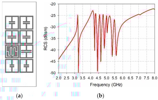 Finally, when two more ELC resonators with l1 = 3 mm and 2.5 mm were appended to make a two-by-four configuration in Figure 13e, the frequency of the resonant peak for the IDC resonator shifted towards a lower frequency at 3.195 GHz with RCS value of −24.82 dBsm. The resonant peak shift is about 0.025 GHz (0.78%), and the RCS increase is about 9.98 dB (28.68%), compared to the single IDC resonator. The results for the resonant peak frequencies and RCS values of the IDC resonator in the five configurations are summarized in Table 2. We see that the RCS value of the resonant peak frequency for the IDC resonator increases as the number of array elements placed nearby increases due to the mutual coupling among the elements. The increase in the RCS value becomes larger as the number of arrays increases in the vertical direction. On the other hand, the variation in the resonant peak frequency is relatively small (less than 0.78%).