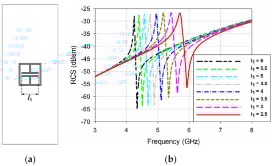 Figure 11 shows the effects on the bistatic RCS characteristics of varying the length of capacitor-shaped plate l1 in the ELC resonator. The length of capacitor-shaped plate l1 was varied between 6 mm and 2.5 mm, with other parameters fixed as seen in Table 1. When l1 = 6 mm, the ELC resonator had a resonant peak at 4.244 GHz and the RCS value was −28.03 dBsm, whereas the resonant peak moved towards a higher frequency at 5.703 GHz with an RCS value of −26.81 dBsm when l1 was decreased to 2.5 mm. Therefore, we can change the position of the resonant peak for the ELC resonator by varying the length of capacitor-shaped plate l1.