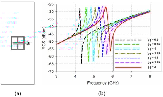 Another way to change the position of the resonant peak for the ELC resonator is by varying the gap between the capacitor-shaped plates (g1). Figure 12 shows the effects on the bistatic RCS characteristics of varying the gap g1 between the capacitor-shaped plates. The gap g1 between the capacitor-shaped plates was varied between 0.5 mm and 2 mm, while the other parameters remained fixed (see Table 1). When g1 = 0.5 mm, the ELC resonator had a resonant peak at 4.244 GHz, and the RCS value was −28.03 dBsm, whereas the resonant peak moved towards a higher frequency at 5.632 GHz with an RCS value of −26.77 dBsm when g1 was increased to 2 mm.