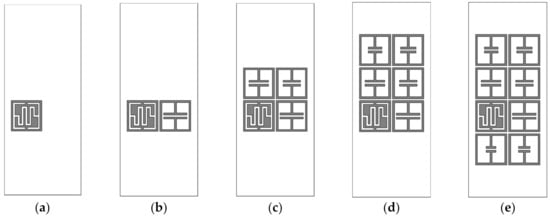Geometries of the array configurations for RCS comparison: (a) the single IDC resonator, (b) the two-by-one configuration, (c) the two-by-two configuration, (d) the two-by-three configuration, (e) the two-by-four configuration.