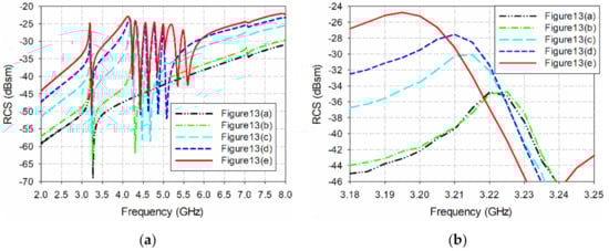 RCS comparison for the five configurations shown in Figure 13: (a) 2–8 GHz, and (b) 3.18–3.25 GHz for the IDC resonator.