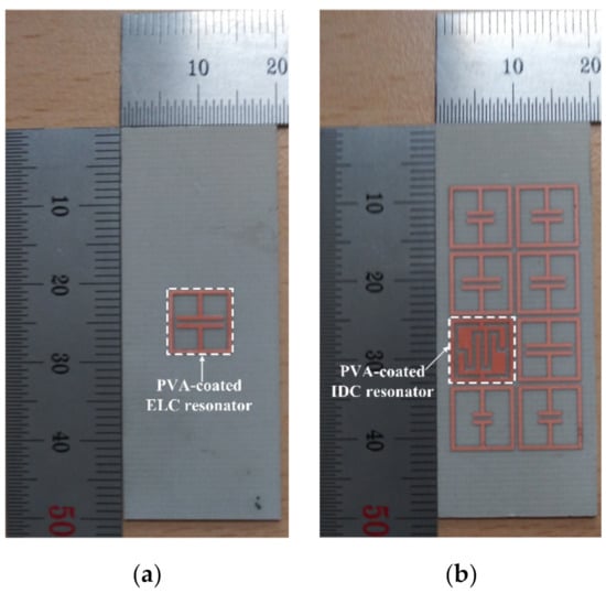 A hygroscopic polymer material, PVA, coated the single ELC resonator and the IDC-based resonator in a two-by-four array at a thickness of 0.02 mm for the comparison of humidity sensing performance. The PVA (degree of polymerization = 1,500, degree of saponification = 99 mol%) was purchased from Yakuri Pure Chemicals Co., Ltd (Kyoto, Japan) []. The PVA solution (a 5 wt% concentration) was prepared by dissolving the PVA in deionized water. The surface areas on the single ELC resonator and the IDC resonator of the proposed eight-bit chipless RFID tag were coated by brushing on 14 mg of the PVA solution, and the PVA-coated resonators were then dried in a convection oven for 120 min at 60 °C.