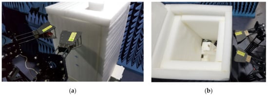 In order to measure the bistatic RCS change in the single ELC resonator and the IDC resonator in the proposed eight-bit chipless RFID tag based on the relative humidity (RH), a non-reflective temperature and humidity chamber was manufactured using Styrofoam, as shown in Figure 16. The outer dimension of the Styrofoam chamber is 500 mm (L) × 510 mm (W) × 830 mm (H). The thickness of Styrofoam is 10 mm in all directions. The temperature and humidity control units of the chamber is placed below the Styrofoam chamber. A humidifier was used to increase the RH, whereas two fans were used to decrease the RH. The tag under test was placed in the middle of the chamber, as shown in Figure 16b. The RH was varied from 50% to 80% in 10% intervals at a temperature of 25 °C in order to measure the bistatic RCS of the proposed tag. For each RH, transmission coefficient S21 was measured after waiting five minutes to stabilize the humidity inside the chamber. It was measured using an N5230A vector network analyzer (Agilent) and two double-ridged horn antennas (C&G Microwave). The non-reflective temperature and humidity chamber was placed in front of the two antennas in an anechoic chamber. The distance between the transmitting/receiving antennas and the resonator under test was also kept at about 300 mm, and the same incident angle of about 30° from the vertical direction of the tag surface was applied to the transmitting antenna.