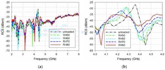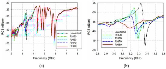 Measured bistatic RCS characteristics of the IDC resonator in the proposed eight-bit chipless RFID tag for varying RH levels: (a) 2–8 GHz, (b) 2.8–3.6 GHz.