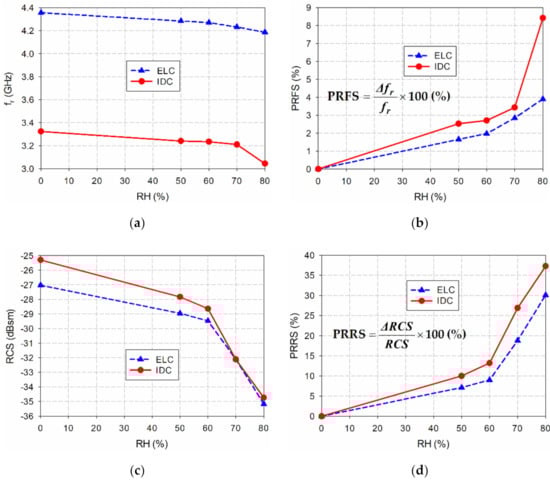 Next, the measured resonant peak frequencies, the percent relative frequency shifts (PRFSs), the RCS values, and the percent relative RCS shifts (PRRSs) of the single ELC resonator and the IDC resonator in the proposed eight-bit chipless RFID tag are compared in Figure 19 as a function of RH. We note that both PRFSs and PRRSs are calculated based on the resonant peak frequency and the RCS value for unloaded conditions (RH = 0%). The definitions of PRFS and PRRS are shown as insets in Figure 19b,d.
