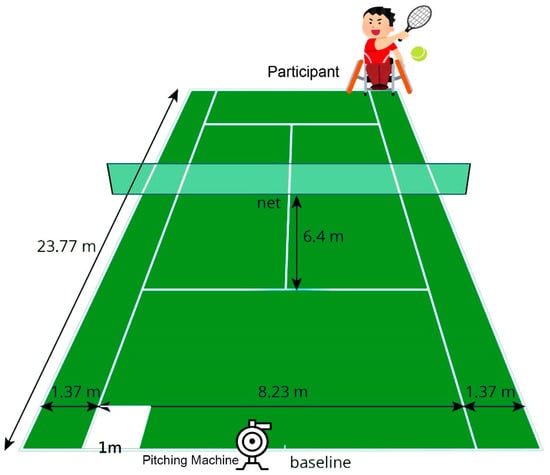 In the sitting position, participants sat on a WC with a seatbelt fastened at the level of the anterior inferior iliac crest, and their feet were placed on the foot rests. The racket was held by the dominant hand, with the other hand placed on the wheel for propulsion. All participants started with a 10 min warm up, including WC propelling and turning, jogging (able-bodied only), and static/dynamic stretches guided by a physical therapist. Backhand stroke practice followed the warm up procedure. A machine (Combo Pitching Machine, JUGS Sports, Tualatin, OR, USA) served the ball at a speed of 80 kph from 1 m behind the baseline of the opposite court towards the player. The player was asked to return the balls steadily and as hard as possible by using the single-handed backhand stroke with a standardized racket (Grand Slam, Wilson Sporting Good Co., Frimley, Camberley, UK) to the opposite side. Each return had to hit the 1 m2 target area at the corner of the baseline in order to be valid (Figure 2). The participants were asked to practice the return until they completed five valid hits.