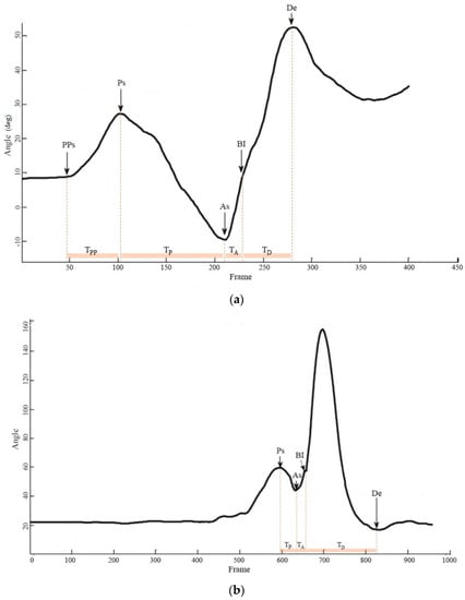 The three phases of the backhand stroke/swing were preparation, acceleration, and deceleration (Giangarra et al., 1993). For trunk segment, we noticed a forward trunk rotation before the preparation phase; therefore, we denoted it as the pre-preparation phase (Table 3; Figure 3a,b). Due to the fact that stroke durations varied greatly, a normalized procedure was used. Data arrays were synchronized, and time was normalized into 100% of a stroking duration by linear interpolation, starting at the beginning of the preparation. Ball impact was set at 75% of the movement, and the deceleration phase accounts for the final 25%. The average duration for stroke completion was about 2.88 ± 1.27 s.