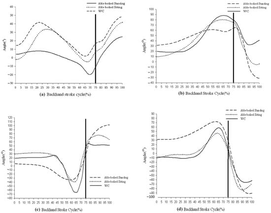 Rapid and high energy motor performances in the kinetic chain require optimal coordination among extremity segments. The lower extremities and proximal large joints are responsible for generating most of the kinetic energy and speed, while energy is efficiently transferred inter-segmentally to distal joints. Without the contribution from lower limb and torso, one can observe many compensatory movements during the backhand stroke of tennis. In summary, there were six key findings in this study. First, compared with the standing condition, the WC condition demonstrated significantly larger angular excursion, velocity, and acceleration for trunk forward rotation during the pre-preparation phase. By moving the trunk forward in the pre-preparation phase, the elastic energy built up from the backward trunk rotation in the preparation phase increases. This elastic energy can be exploited at the moment of contact between racket and ball. In proximal joints, shoulder joint flexion and internal rotation were used to improve backhand performance in the WC condition. The authors noticed that when AB tennis players changed from the standing position to the sitting position, the most significant change was observed in the degree of forward rotation of the trunk. This may be attributable to using the stretch–shortening cycle in the preparation phase to contract the right external oblique eccentrically (in a right-handed player) and to accumulate sufficient elastic potential energy to compensate for the reduced energy generated by the trunk rotation angle, thereby improving the energy of the backswing and improving swing quality.