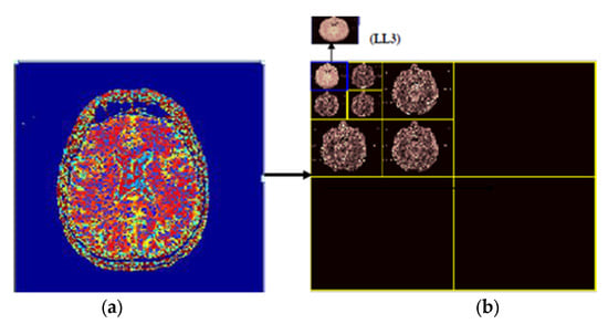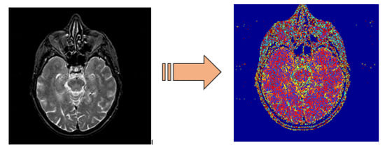 Numerous types of image filters are available in the literature, such as mean filter, median filter, wiener filter, and different types of image noises that exist, such as space noise, Gaussian noise, salt and pepper noise, speckle noise. Hence, it is of utmost importance to apply an appropriate filter for noise removal for images. In the proposed work, we have used the MR grayscale brain images, and these types of images are affected by salt-and-pepper noise [,]. For this purpose, we have used a median filter to remove salt-and-pepper noise from MR brain images. The median filter has the capability of sharpening the images and preserving the edges. We have used window size: 3 × 3 masks; this size is suitable because the large window size of the mask affects the image edges and requires high computation time. After salt and paper removal the grayscale images are converted to RGB images, Figure 2 shows a grayscale image along with RGB image. These RGB images are further fed as inputs to the DWT layer to get an approximate image size.