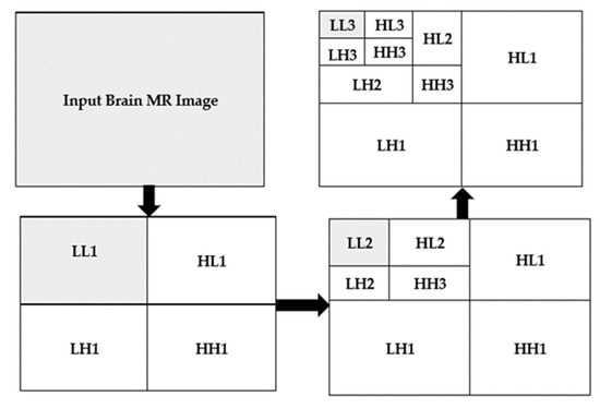 In this work, the focus is on 2D imaging; hence, it is required to use DWT to each dimension disjointedly. The schematic diagram of the DWT is illustrated in Figure 3. As depicted, that each level is divided into four sub-bands, namely Low-Low (LL), Low-High (LH), High-High (HH), and High-Low (HL) images at each level, and 1, 2, and 3 signify the according levels. The division of the LL sub-band is further carried out into the four previous stated bands. The detailed component of the image is represented by LH, HL, and HH []. The compaction of the image is incremented with the incrementation of levels, but the quality of the desired approximate image is decreasing. In this work, a level-3 decomposition was carried out using Harr wavelet to approximate solid information. In the first level of decomposition, the image is divided into four sub-bands, namely LL1, LH1, HH1, HL1, in which the LL represented approximate image (LL1) which is of essential and further it is considered for processing. In the second level of decomposition, the LL1 is further decomposed into four sub-bands, namely LL2, LH2, HH2, and HL2. The LL2 approximate image is further considered for processing. In the third level of decomposition, the LL2 is further decomposed in four sub-bands named LL3, LH3, HH3, and HL3.